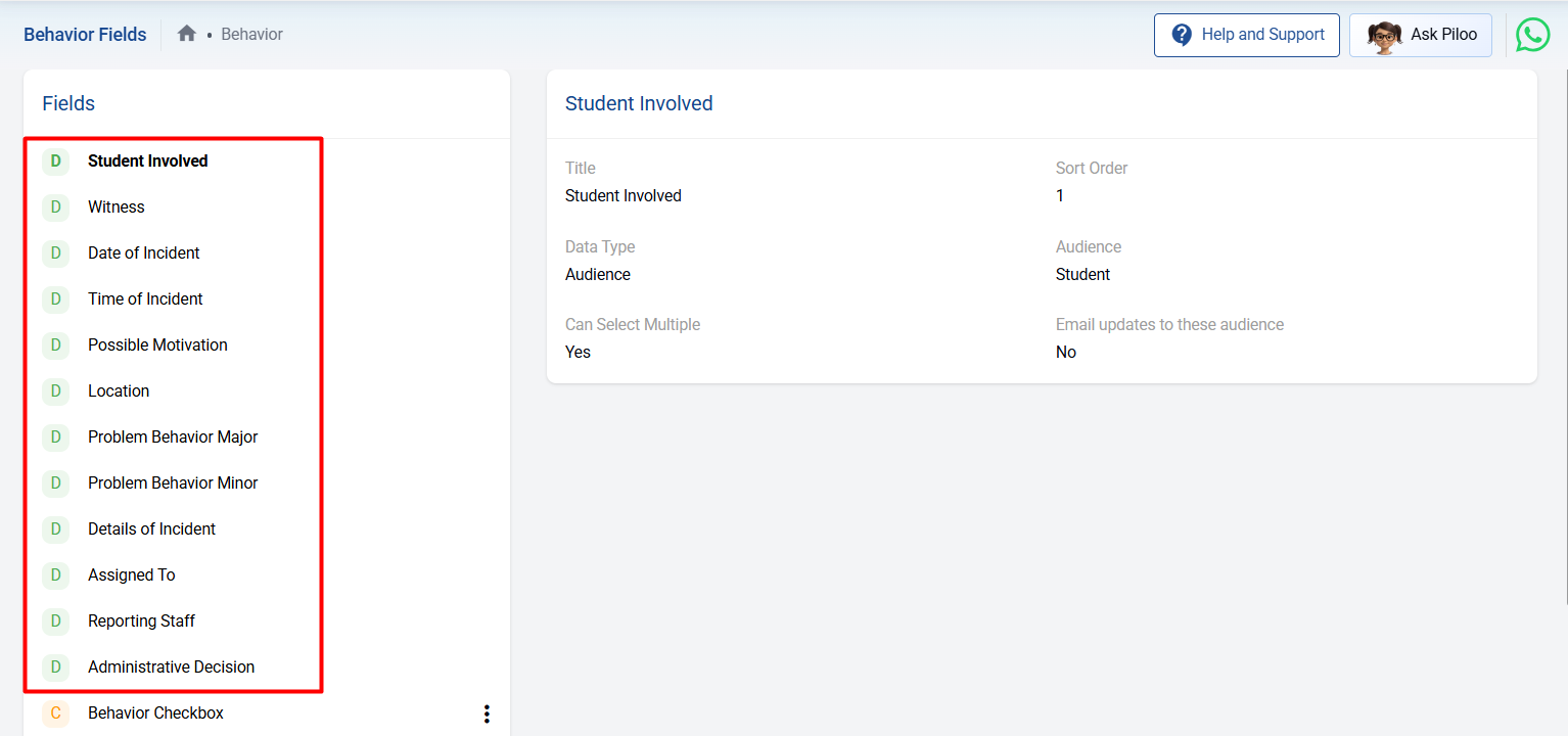 Default Behavior Fields are system-defined fields that appear automatically when recording a behavior incident. They are designed to capture the minimum required information for effective behavior tracking and administrative decision-making.