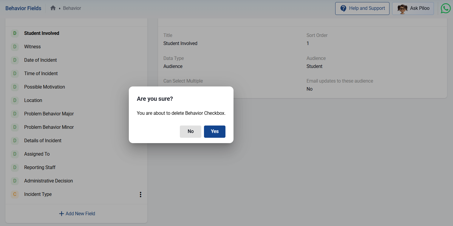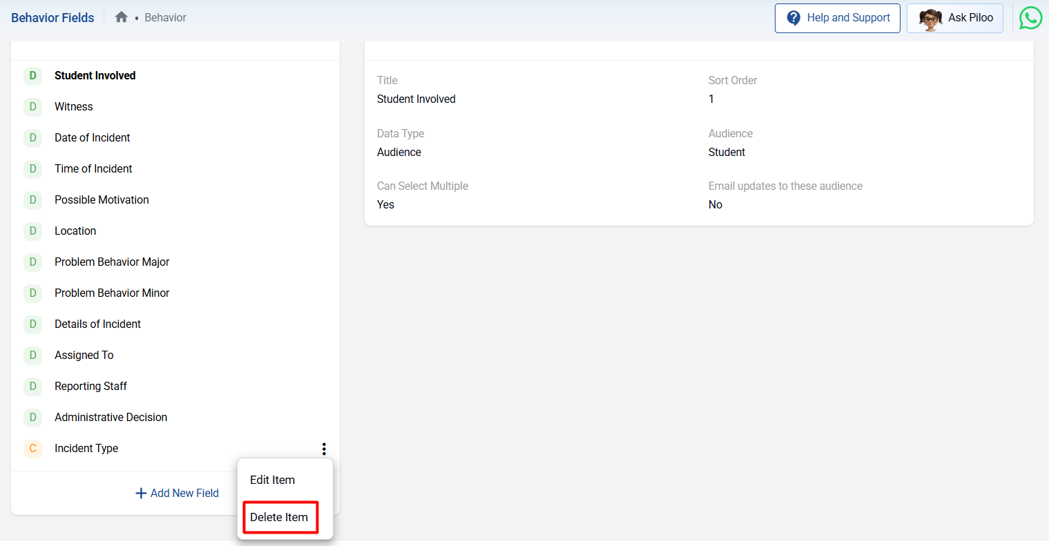 openSIS allows administrators to delete custom behavior fields that are no longer required. Removing unused fields helps keep the behavior incident form clean and relevant.