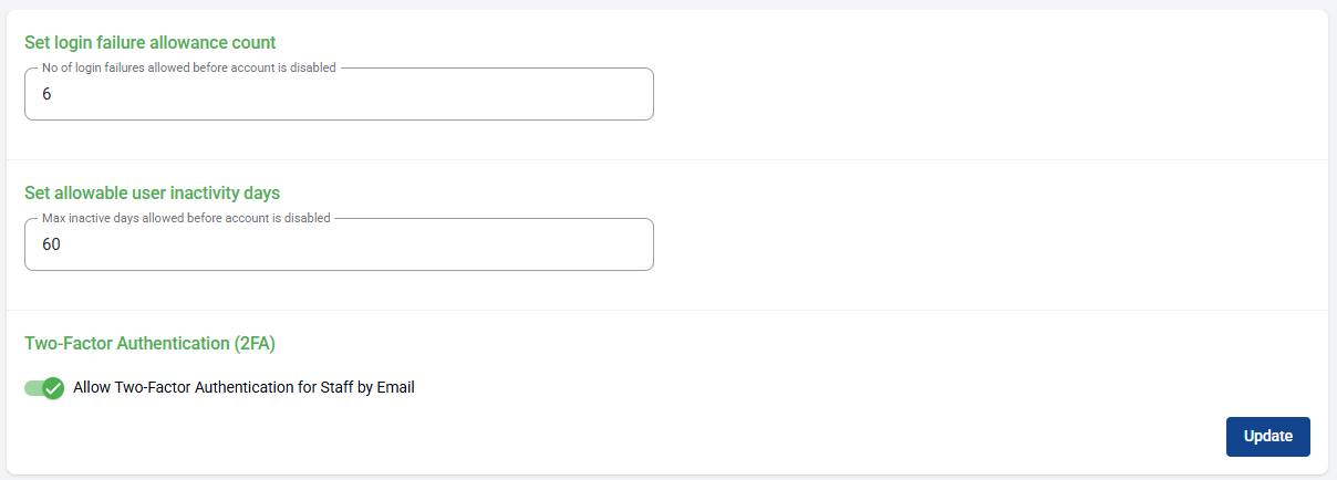 Settings → School → PreferencesSlide the switch "Allow Two-Factor Authentication for Staff by Email" to turn on or off the 2FA requirements for all the Staff in the system. Click update to save.